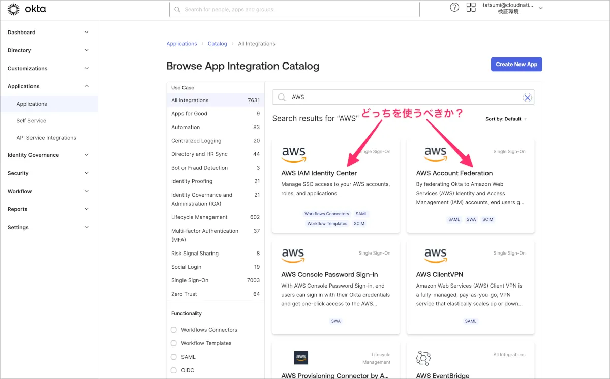 AWSマネジメントコンソールへのSSOをOktaで実施しようとBrowse App CatalogからAWSと検索するとSAMLに対応したAWS IAM Identity CenterとAWS Account Federationの2つが確認できます。