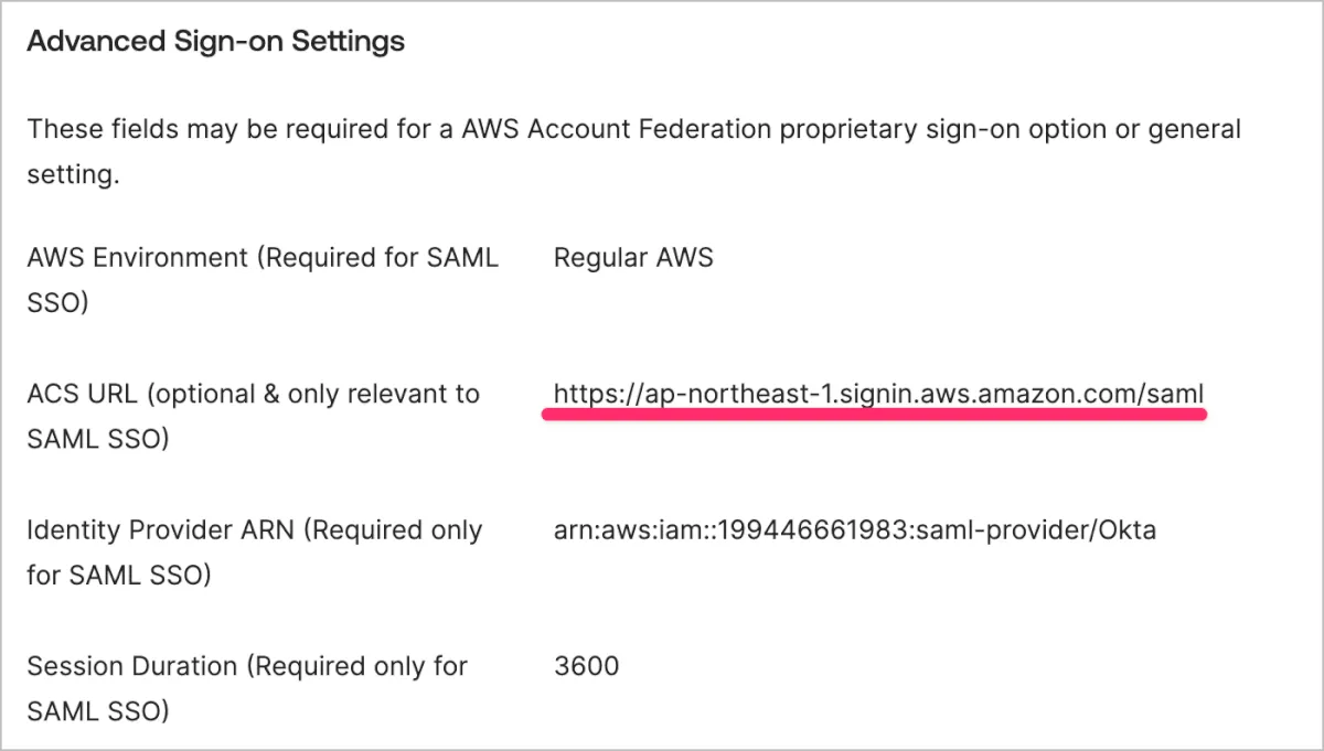 SSOアプリの作成の手順3.でAdvanced Sign-on Settings内のACS URL (optional & only relevant to SAML SSO)にhttps://ap-northeast-1.signin.aws.amazon.com/samlを設定します。