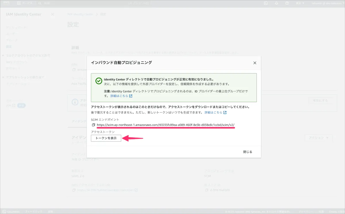 - 以下のようにSCIMエンドポイントとアクセストークンが表示されます。