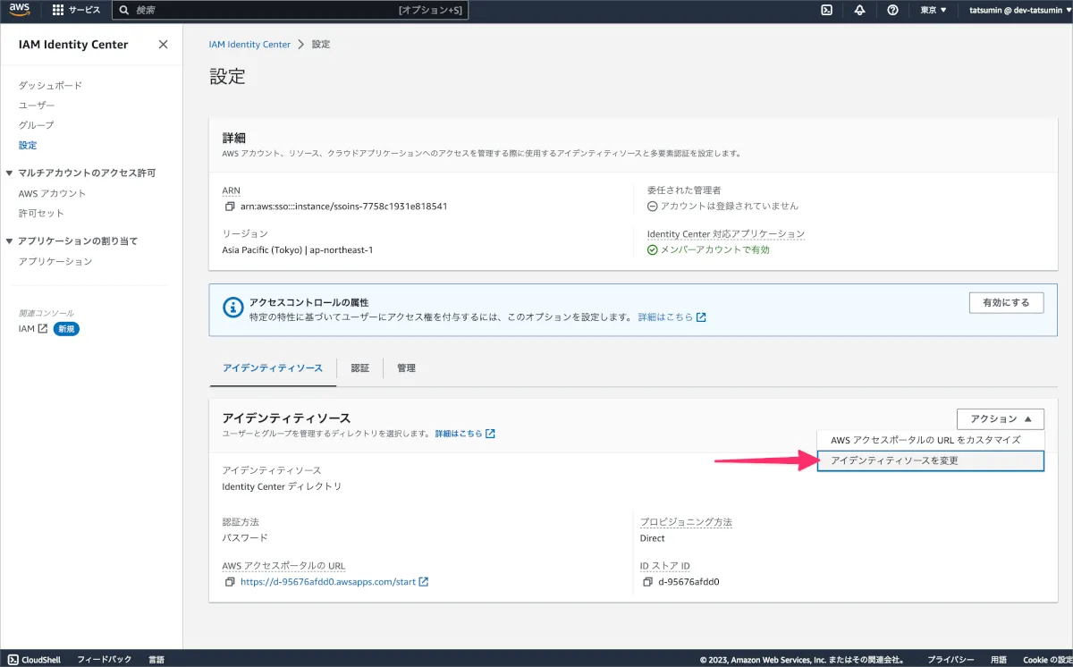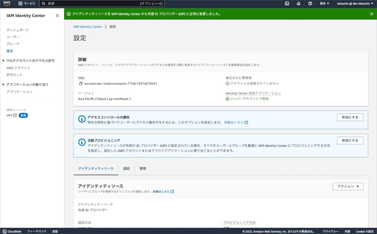 - 成功すると以下のようにアイデンティティソースを IAM Identity Center から外部 ID プロバイダー (IdP) に正常に変更しました。と表示されます。