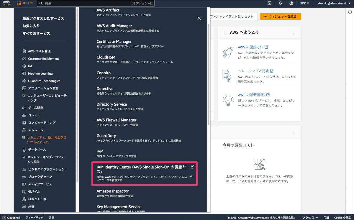 - AWSマネジメントコンソールにアクセスし、サービス>セキュリティ、ID、およびコンプライアンスからIAM Identity Centerをクリックします。