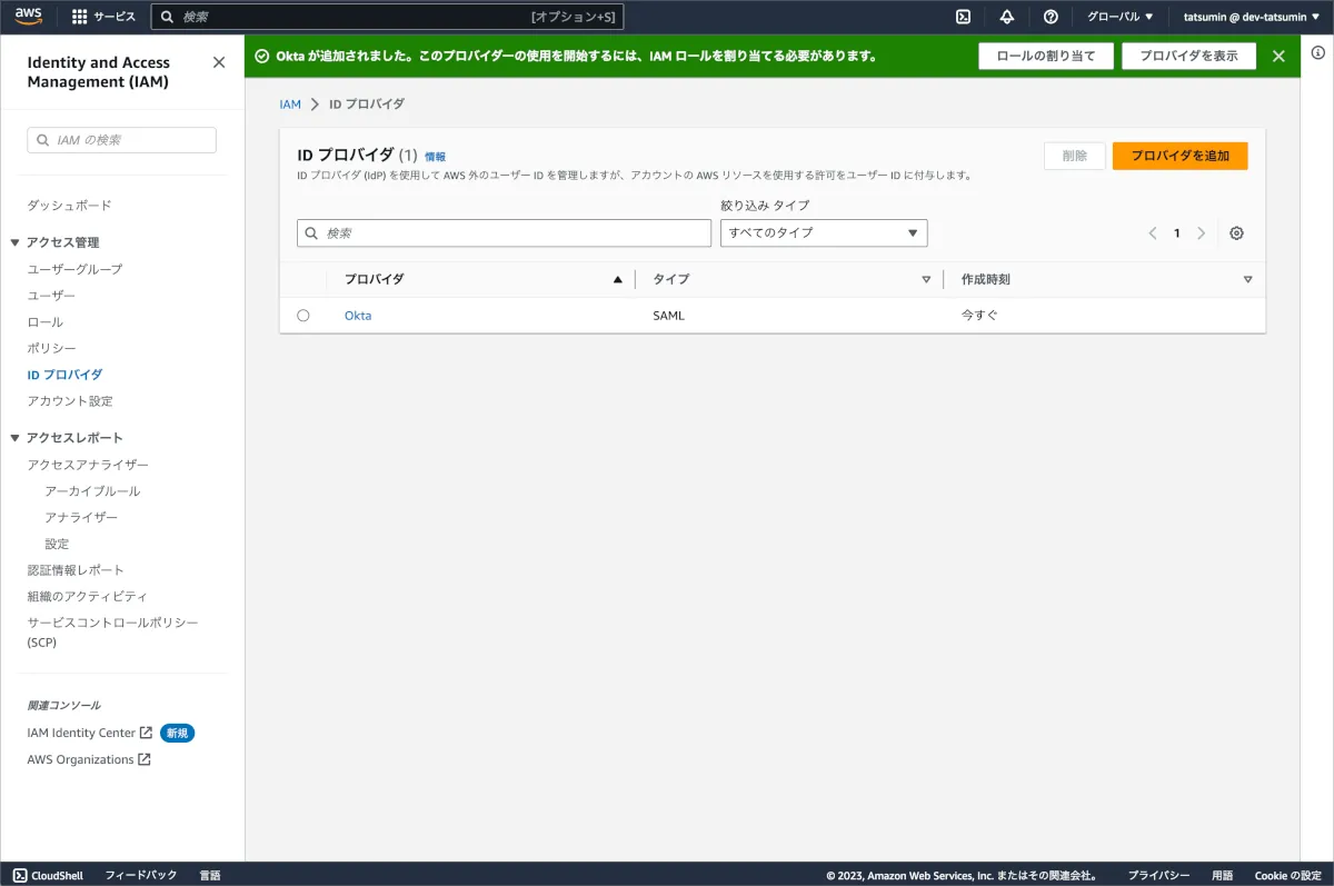 - 以下のようにIDプロバイダが作成されます。プロバイダ名のOktaをクリックします。