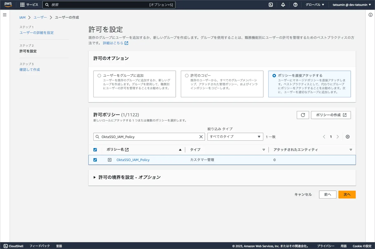 - 作成したポリシー名で検索し、選択後に次へをクリックします。