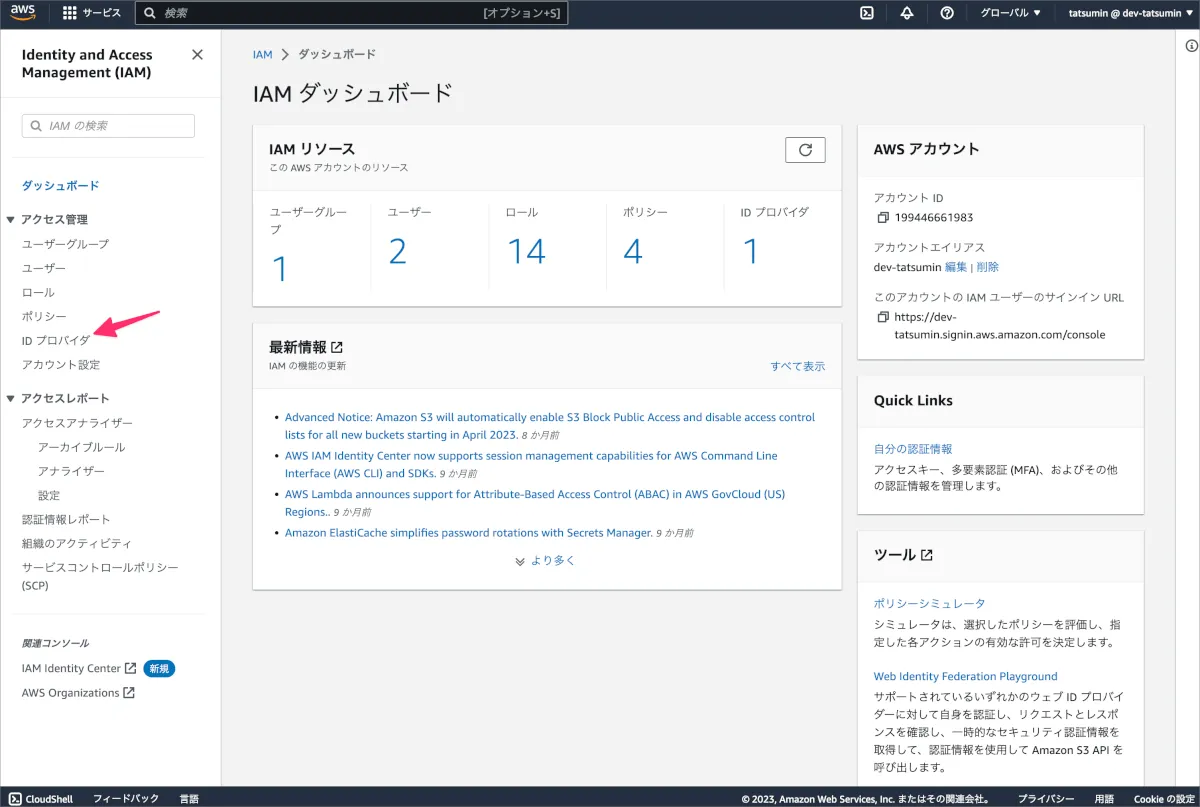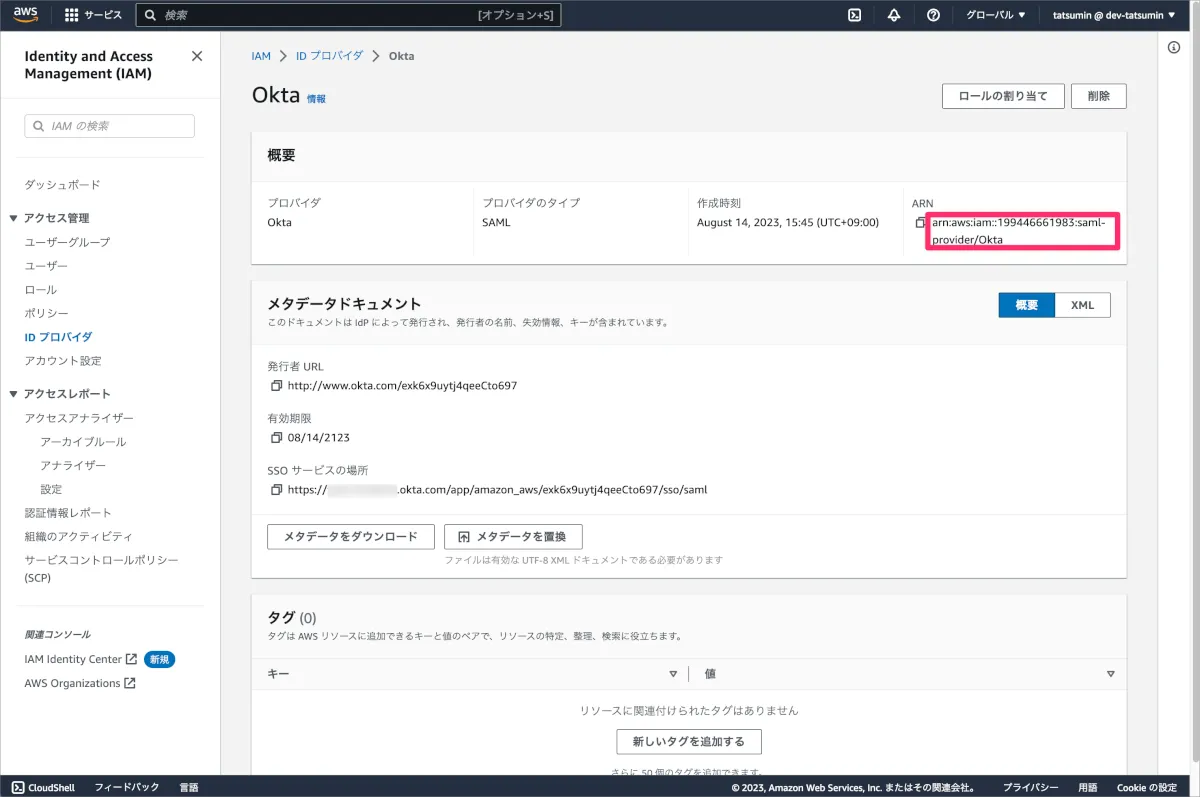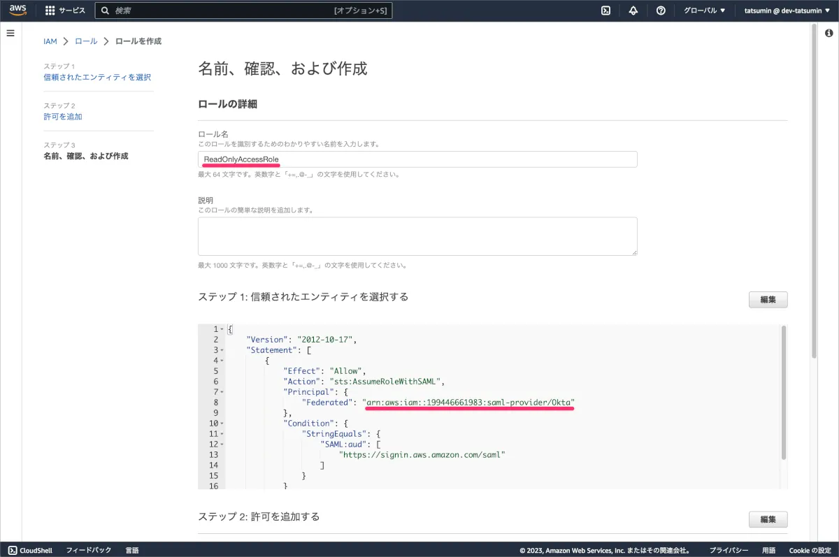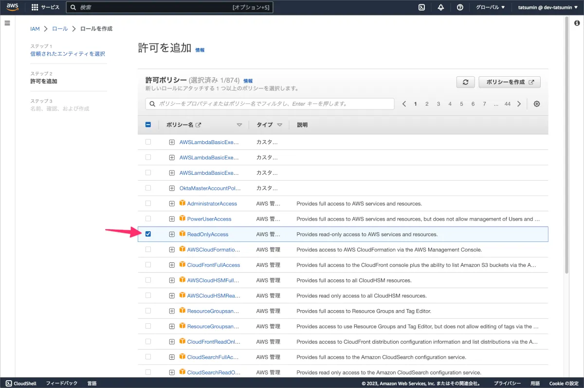 "Arn": "arn: aws: sts:: 738860711435:assumedrole/AWSReservedSSO_ReadOnlyAccess_19df826175ceac56/tatsumi@cloudnative.co.jp"