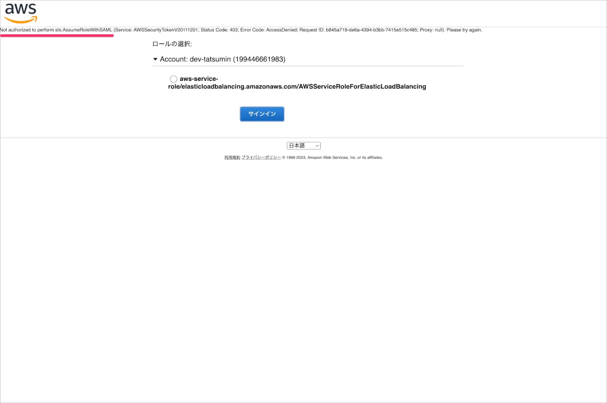 もし、アサイン時にSAML User Rolesを何も選択をしていない場合は以下のようにNot authorized to perform sts:AssumeRoleWithSAMLというエラーが発生します。