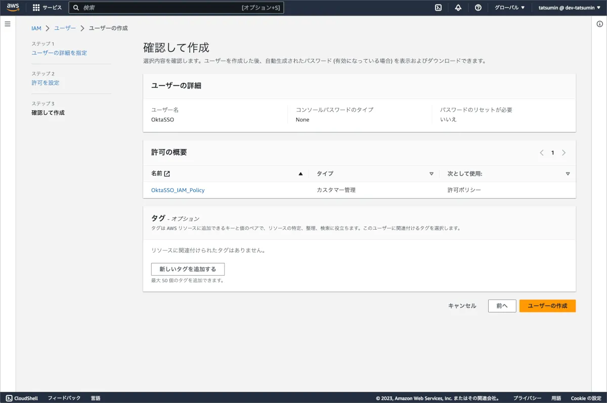 - 対象ユーザーと許可ポリシーに誤りがないことを確認し、ユーザーの作成をクリックします。
