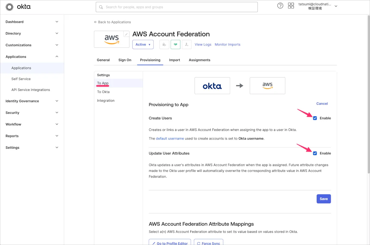 - ProvisioningタブのTo Appへ移動し、Create UsersとUpdate User Attributesにチェックを入れ、Saveをクリックします。