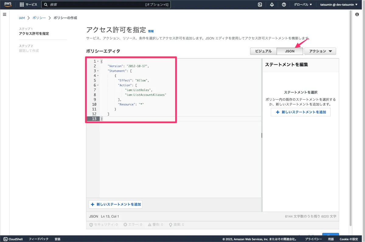 - 新しいタブで開いたポリシーエディタをJSON形式に変更し、View Setup Instructionsに記載の内容に沿って以下の画像のように設定をし、次へをクリックします。