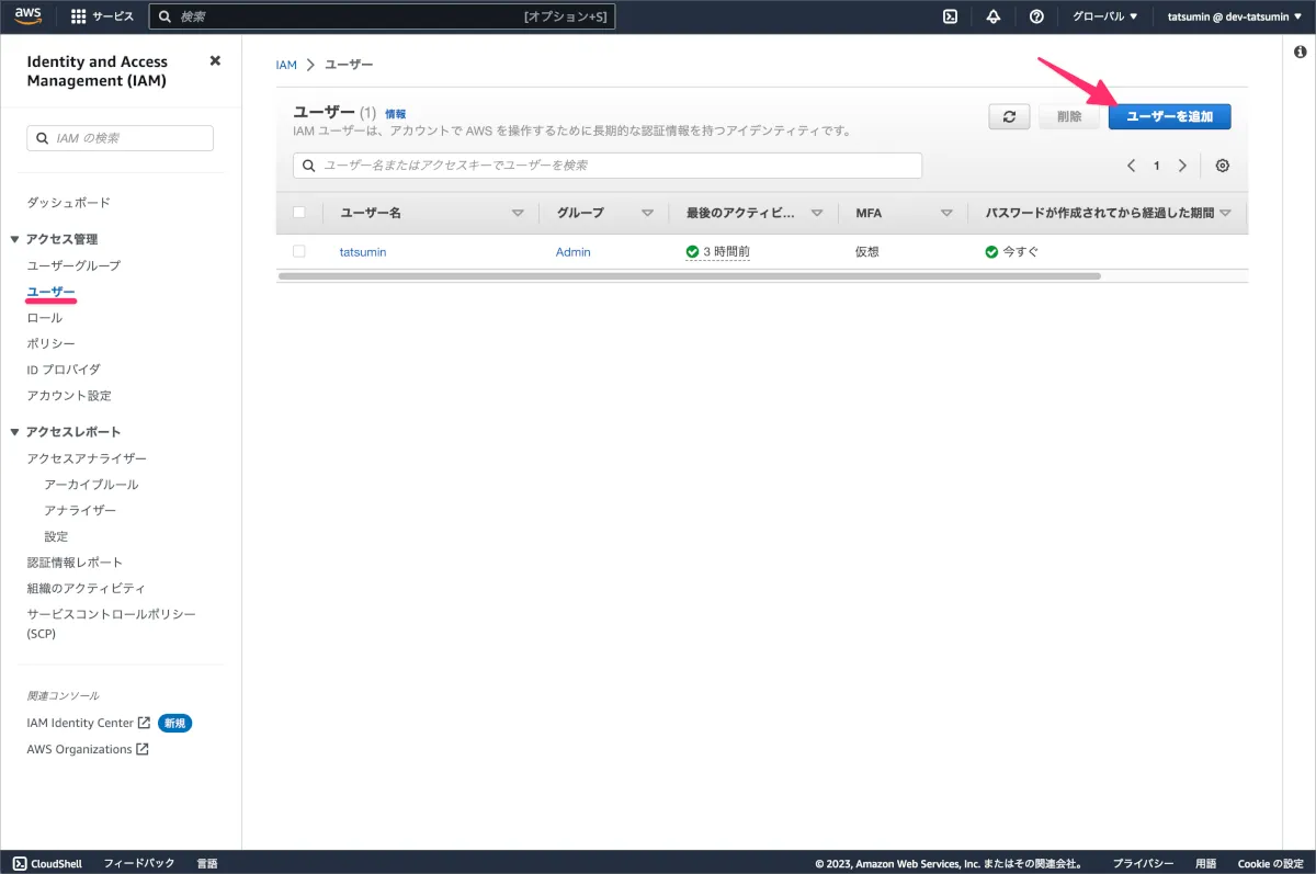 - AWS IAM画面の左側のメニューからユーザーをクリックし、ユーザーを追加をクリックします。