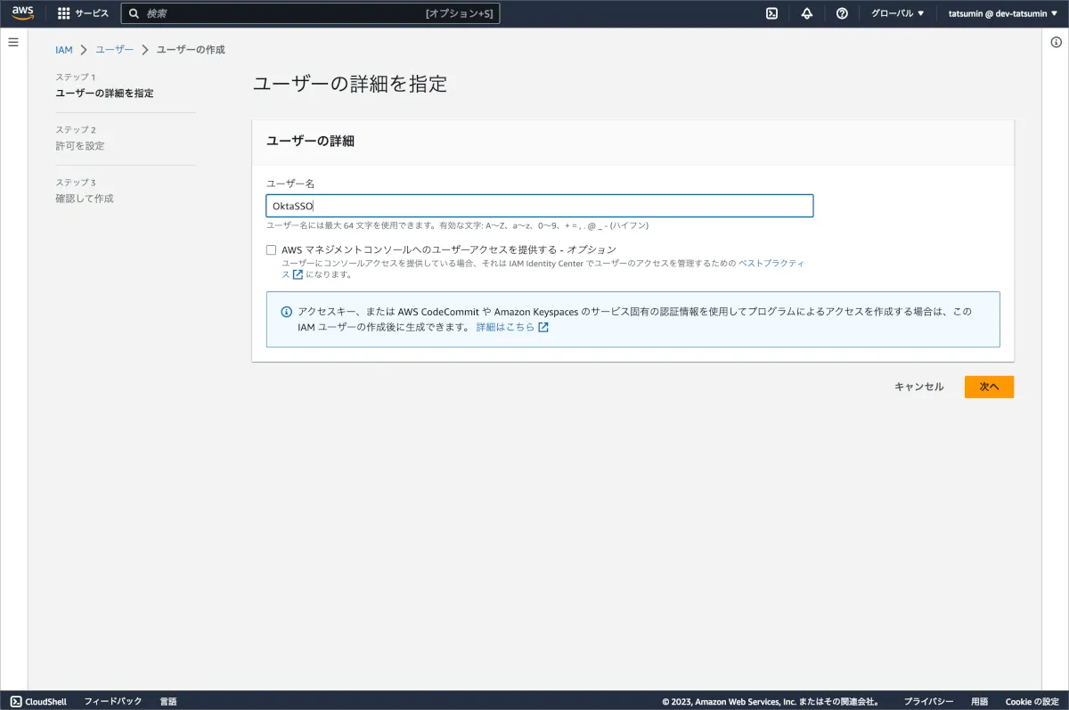 そこで以下の手順でOktaユーザーをAWSアカウントとの紐付けを行います。