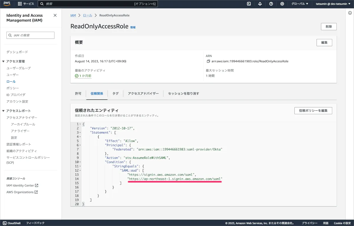 SAML User Role設定の手順4.で作成した信頼されたエンティティの信頼ポリシーを編集し、以下のようにSAML:audにhttps://ap-northeast-1.signin.aws.amazon.com/samlを追記します。もちろん複数のSAML User Roleを設定しているう場合は必要なSAML User Roleについて同じ操作を実施します。