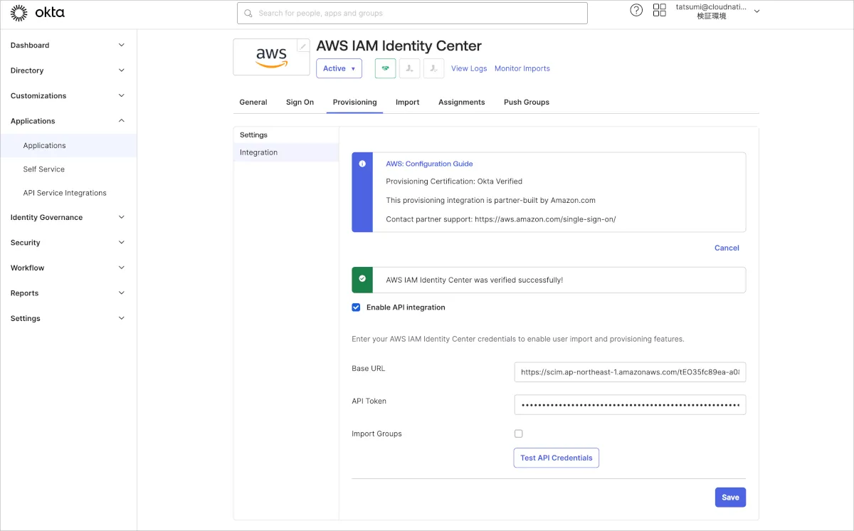 - Test API Credentialsをクリックし、以下のようにAWS IAM Identity Center was verified successfully!と表示されたら、Saveをクリックします。