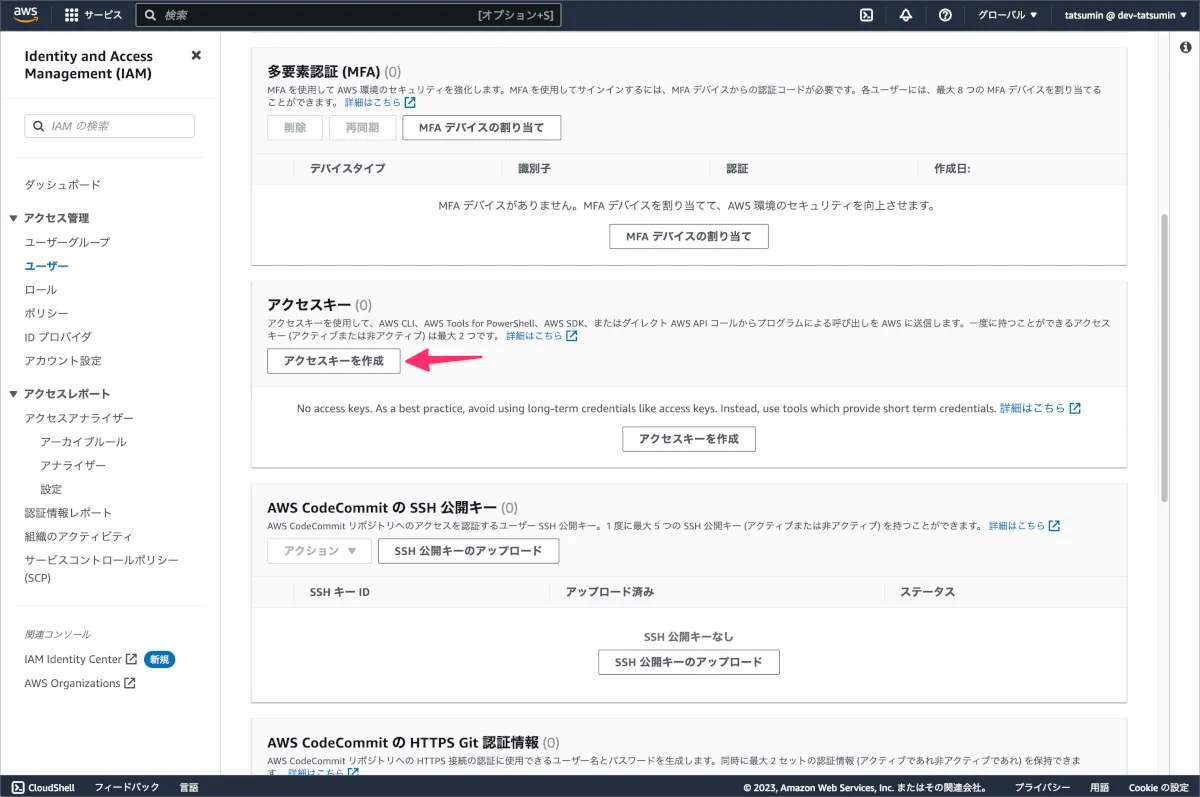 - アクセスキーの項目でアクセスキーの作成をクリックします。