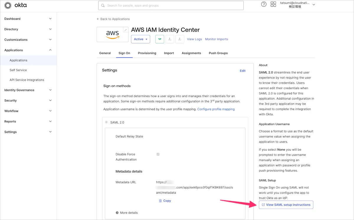 - Sign onタブに移動し、Sign on methodsをSAML 2.0を選択し、View Setup Instructionsをクリックします。