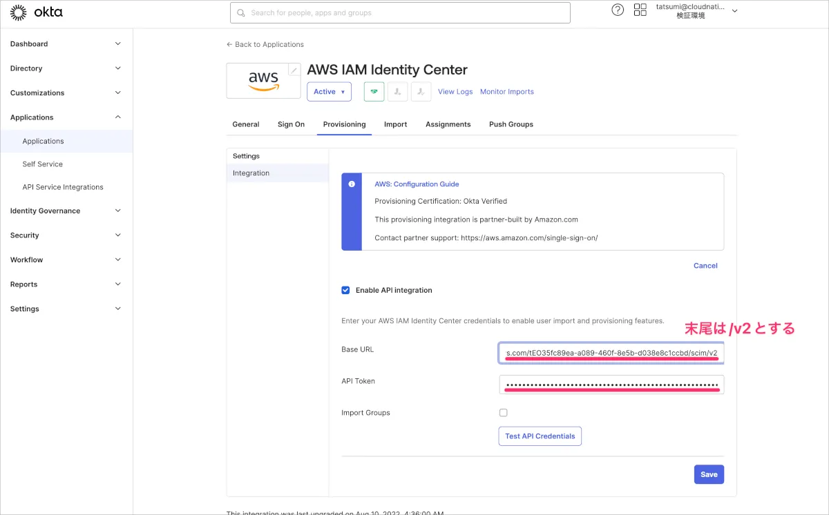 - OktaでProvisioningタブに移動し、Editをクリック後にEnable API integrationにチェックを入れBase URLに手順2.のSCIMエンドポイントを貼り付けます。この時に/v2/から最後の/を削除し、/v2とする必要があります。
