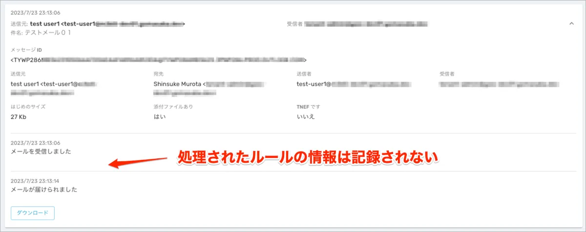 - ただし、トレースログ内に処理ルールが表示されているか、表示されていない違いでどちらで処理されているか判別ができる