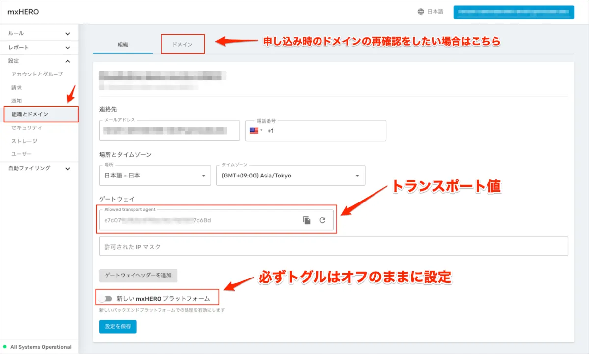 「新しいmxHEROプラットフォーム」トグルはあくまでもメールドメインに対して新旧の向き先を変更するに過ぎないため、同じ処理内容を行わせる場合は新旧mxHEROテナント内の設定内容が一致している必要があります。