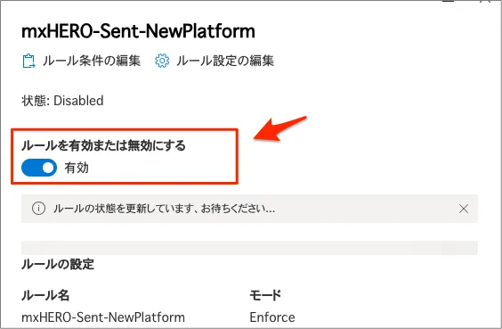「手順⑥:新規でmxHEROへの転送ルールをテスト用グループ指定で作成し、有効状態へ変更」で有効にしたルールの反映が10分ほど時間かかる場合があります