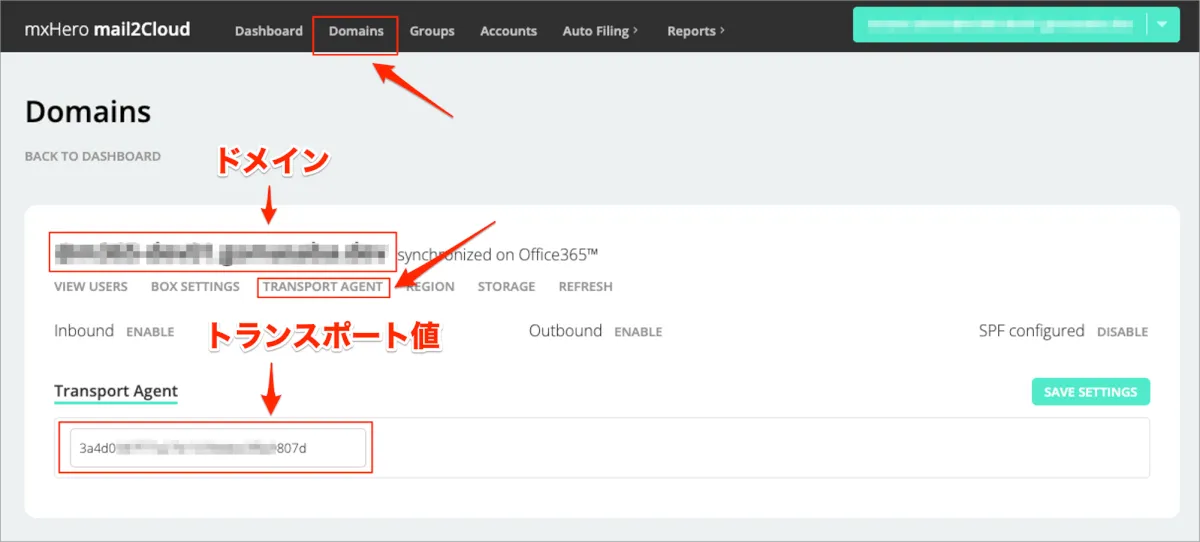 - 上部メニュー「Domains」を選択し、「TRANSPORT AGENT」メニューを選択
