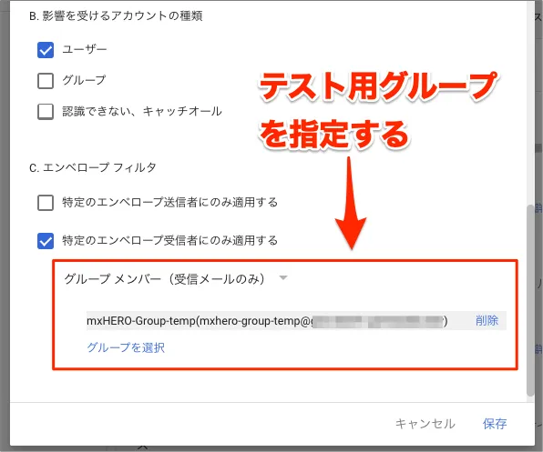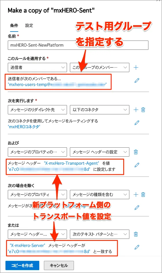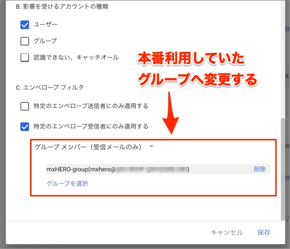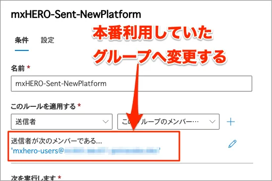 - 「手順⑥:新規でmxHEROへの転送ルールをテスト用グループ指定で作成し、有効状態へ変更」で作成した新プラットフォーム用に作成した転送ルールの対象グループの条件を既存の転送ルールで仕様していたグループへ変更します
