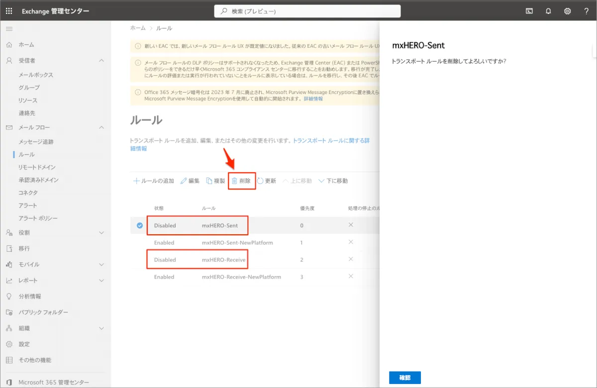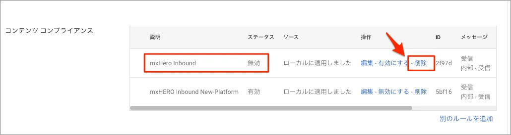 - 「既存のmxHEROへの転送ルールを無効にする」で無効にした既存の転送ルールを削除する