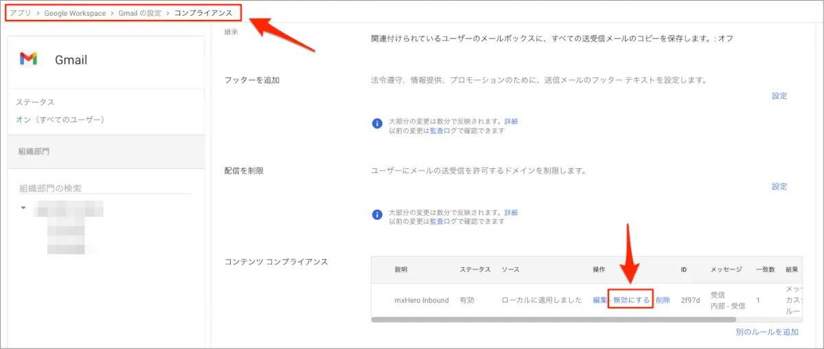 - 既存の受信メールをmxHEROへ転送する「コンテンツコンプライアンス」を無効にする