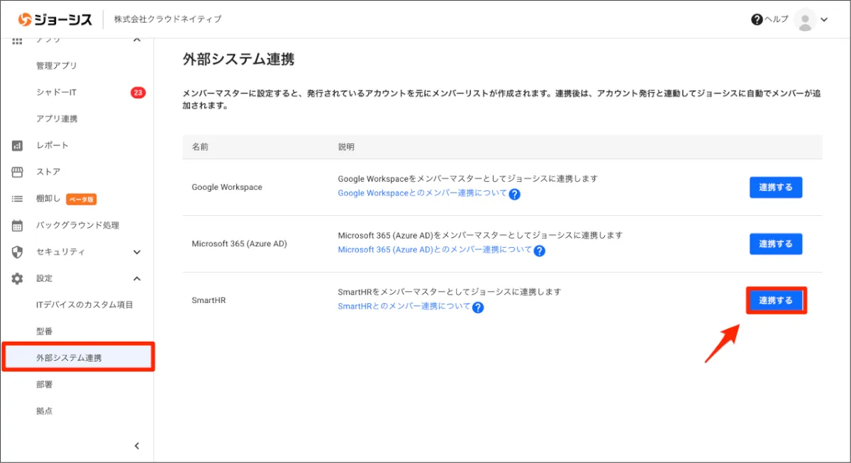 最初に行う「1. 外部ユーザーソースとの連携」では、外部システムとジョーシスを連携し、ジョーシス側のユーザーソースを作成します。ユーザーソースはGoogle Workspace、Microsoft 365、SmartHRが選択できますが、当社ではSmartHRをユーザーソースとして利用しました。