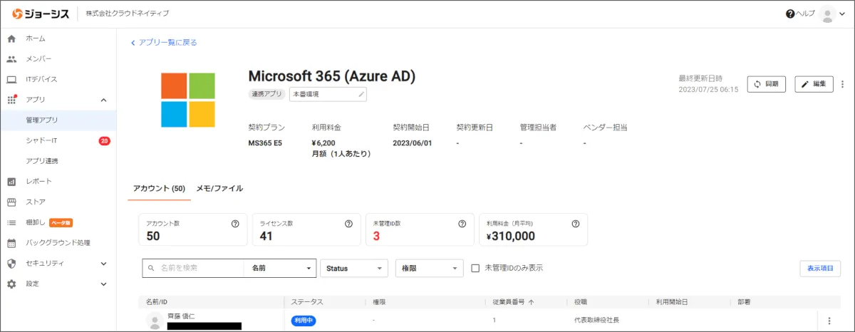 続いて、ジョーシス目玉機能の1つでもある「アプリごとの利用状況の可視化」機能についてご紹介します。この機能を使うと、アプリ(SaaS)上に存在するシステムアカウントや検証アカウントの利用者を明らかにし、”利用者不明” という恐怖・ストレスから情報システム管理者を解放してくれます。
