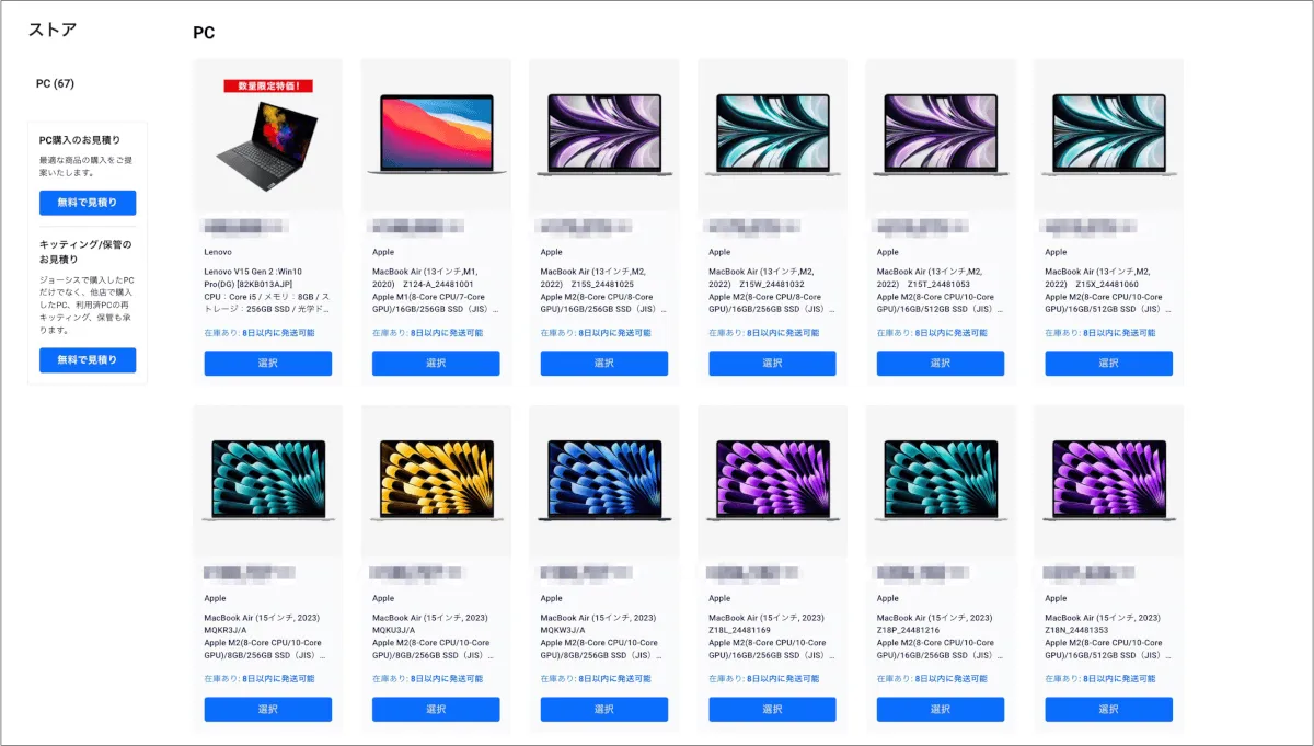 ジョーシスのストアではWindows・Macともにさまざまなスペック、モデルが用意されています。カタログにある機種は在庫で用意しているものになるので短期間で納品してもらえます。急な入社対応などすぐに新しいデバイスが必要な時に重宝すると思います。