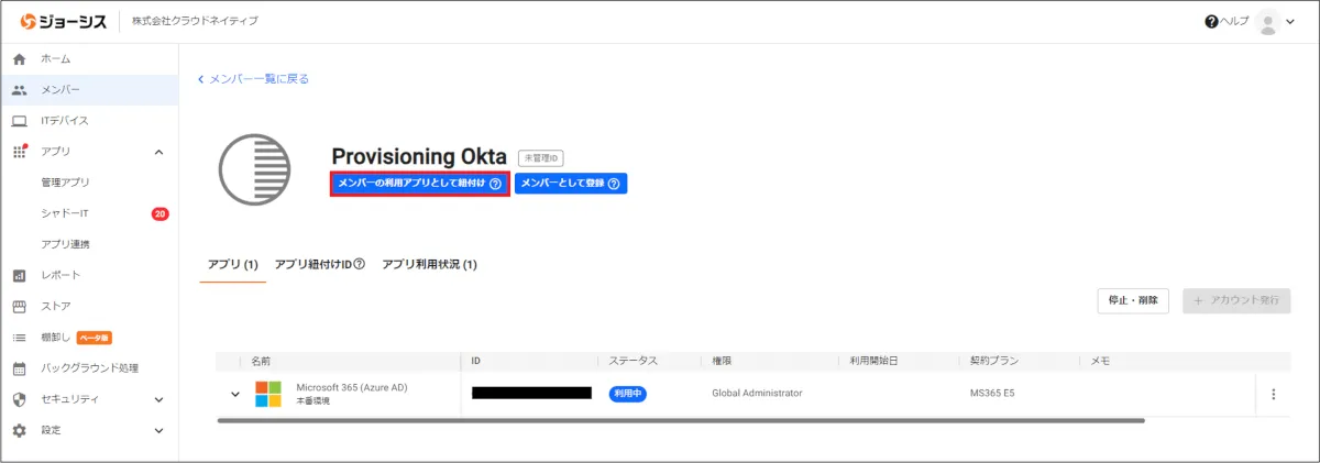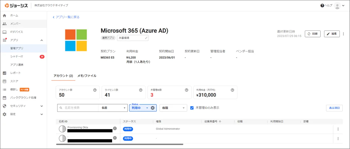 一方、属性情報が既存のユーザー属性と一致しない SaaS ユーザーが存在する場合、ジョーシスでは “未管理ID” として登録されます。