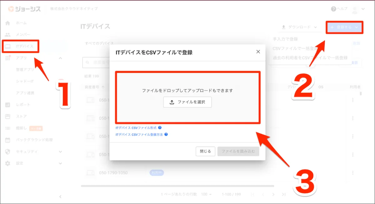 次に行う「2. CSVのアップロード」では、CSVをアップロードしてITデバイスを登録します。弊社では他社ITAM製品を用いて管理していましたが、ジョーシスを使い始めるにあたって、他社ITAM製品からCSVエクスポートした情報をジョーシスのCSVフォーマットに当てはめてインポートしました。