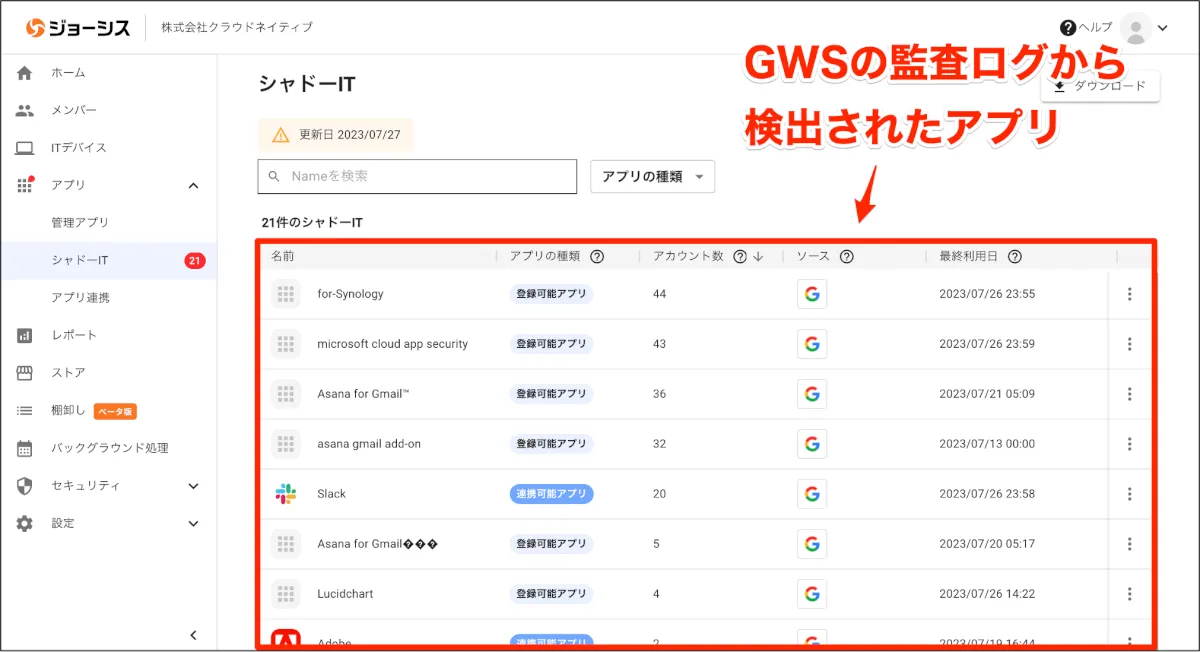 もし、企業でGoogle WorkSpace(GWS)を利用している場合、GWSと連携して利用しているアプリの棚卸しができます。ジョーシスをGWSと接続すると、GWS監査ログを取得し、管理アプリとして登録されていないアプリの利用の形跡があった場合は一覧が表示されます。