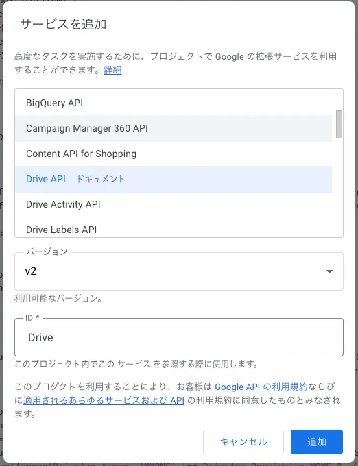 ※2024/03/22 追記:DriveAPI v3が出てますが、v3では正しく動作しないのでv2を選択してください。