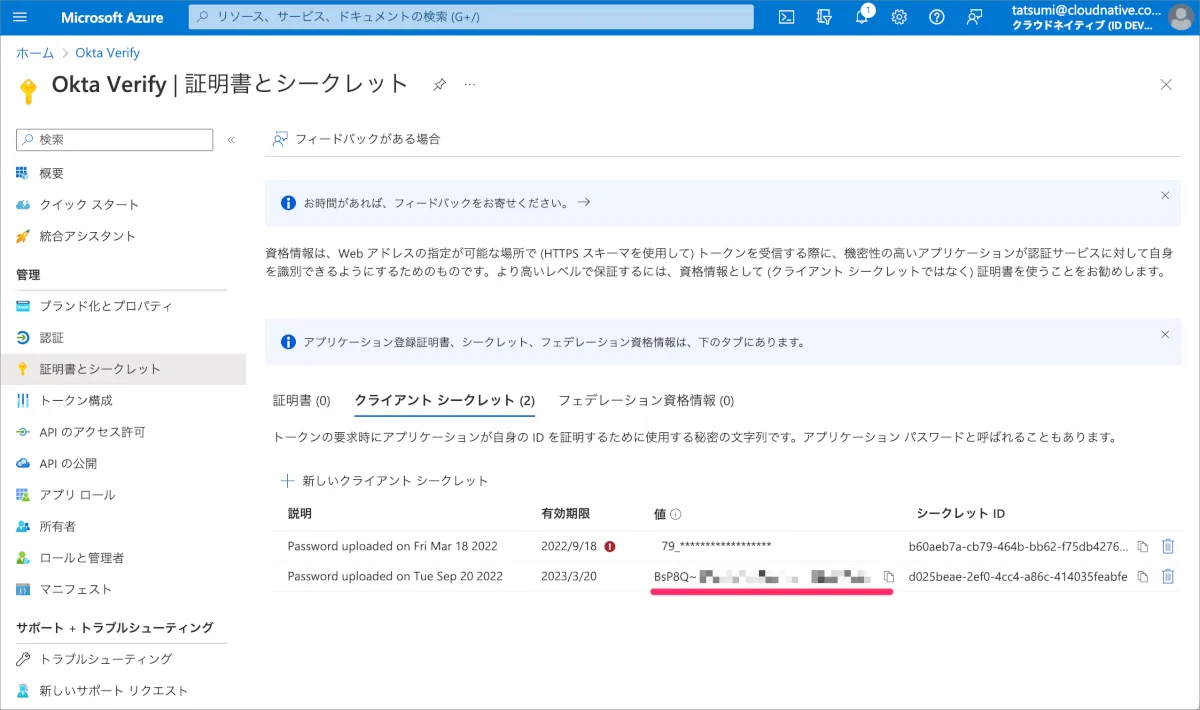 今回のスクリーンショットでは2022/09/18に有効期限を迎えており、その2日後の2022/09/20に新しいクライアントシークレットを発行していますが、本来は有効期限を迎える前に作業を実施しましょう。