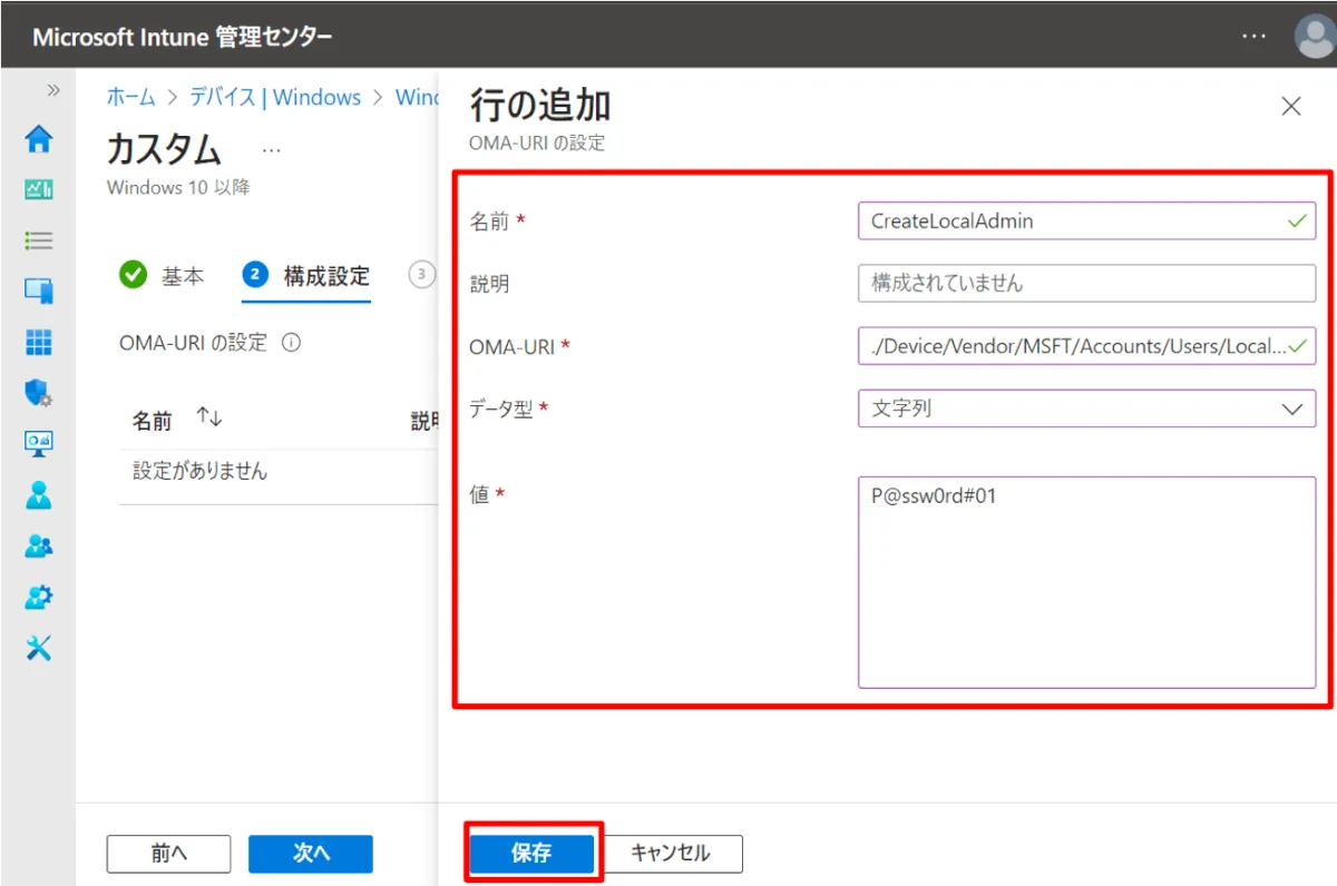 ./Device/Vendor/MSFT/Accounts/Users/<作成したいローカル管理者名>/Password- ローカル管理者名は利用させたいユーザーがわかりやすいものをおすすめしますが、本例は “LocalAdmin01” で設定