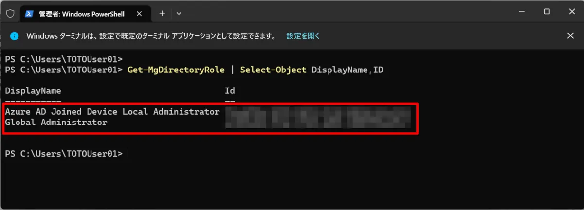 ② 接続後、以下のコマンドでグローバル管理者と Microsoft Entra 参加済みデバイス ローカル管理者の ID を確認します。