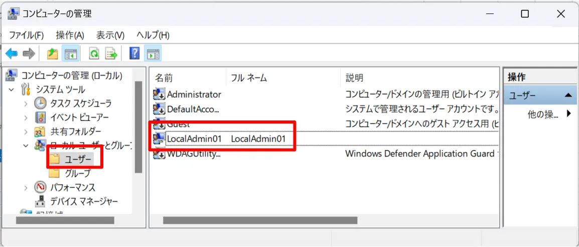 端末の [Windows] ボタン右クリック > [コンピューターの管理] > [ローカル ユーザー とグループ] > [ユーザー] よりポリシーで作成したローカル管理者が確認できます。