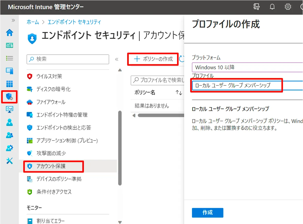 ② 左メニューより [エンドポイント セキュリティ] > [アカウント保護] > [+ ポリシーの作成] > [ローカル ユーザー グループ メンバーシップ] を選択して作成します。