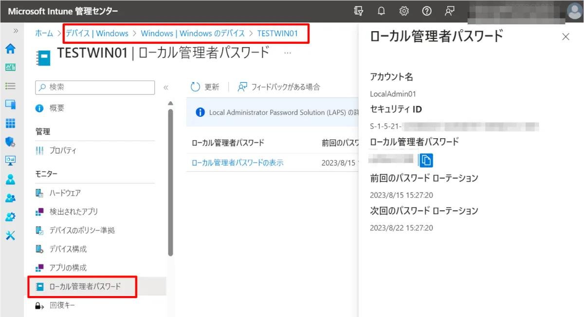 Microsoft Intune 管理センターでは [デバイス] > [Windows] > [Windows のデバイス] > [<対象デバイス>] > [ローカル管理者パスワード] から確認できます。