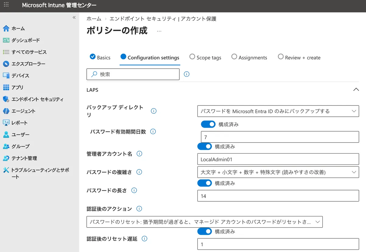 ローカル管理者に対するポリシーの構成 (パスワードの複雑性や有効期限、リセットタイミングなど) を行います。