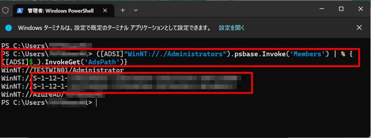 ③ 以下のコマンドでグローバル管理者と Microsoft Entra 参加済みデバイス ローカル管理者の SID が確認できます。