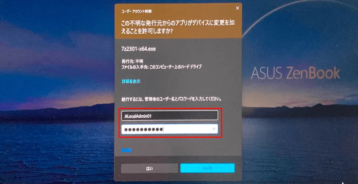 Windows LAPS では、ユーザーが管理者権限が必要な操作を行うときに表示されるユーザーアカウント制御 (UAC) にローカル管理者パスワードを入力することで端末のユーザー切り替えを行うことなくローカル管理者権限操作を実行できるため、業務ユーザーに対して時限的にローカル管理者権限を貸し出したいニーズにも使えるでしょう。