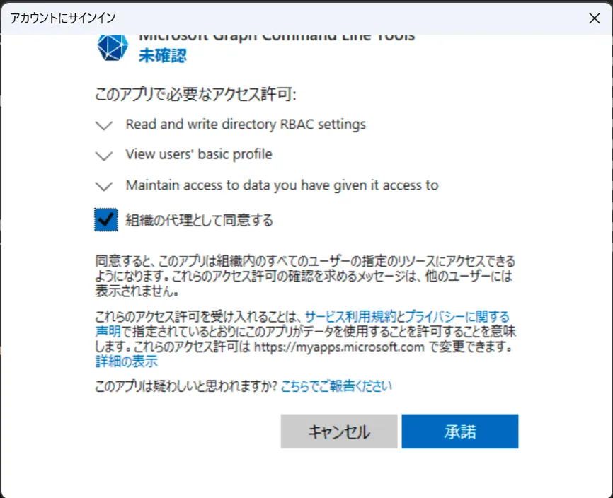途中認証が走り、アプリ読み書き許可の承認が求められます。