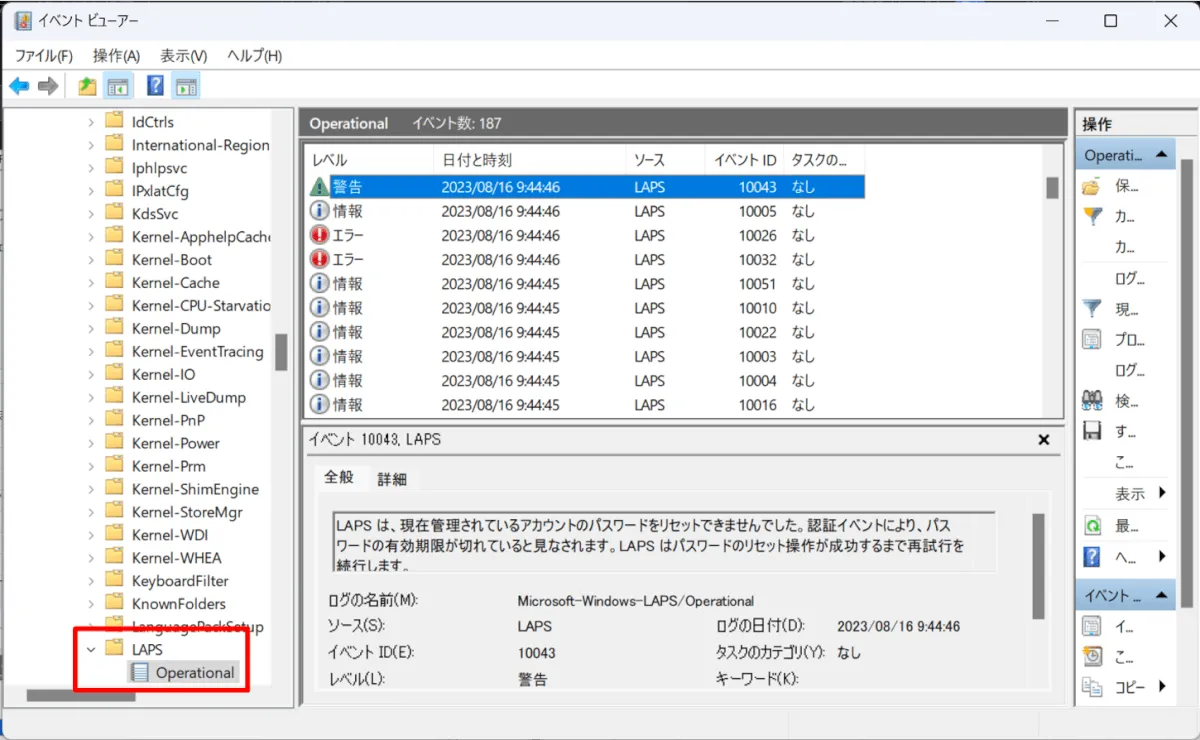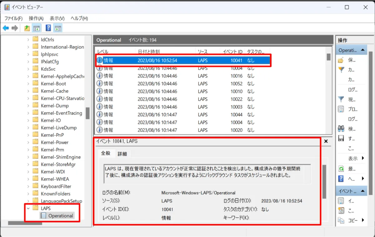 端末ではイベントビューアより [アプリケーションとサービス ログ] > [Microsoft] > [Windows] > [LAPS] > [Operational] から確認できます。パスワード実行検出・変更スケジューリングのログや定期的に適用されている LAPS ポリシーの内容などが確認できます。