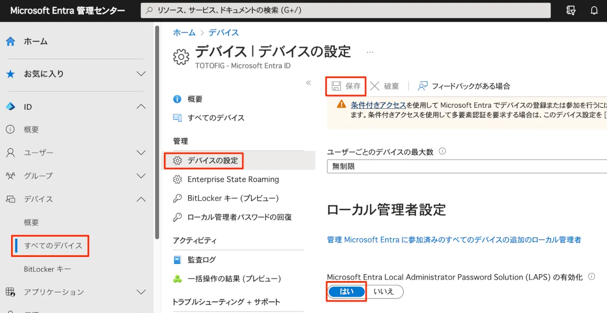 ③ “Microsoft Entra Local Administrator Password Solution (LAPS) の有効化” を “はい” に変更して保存します。
