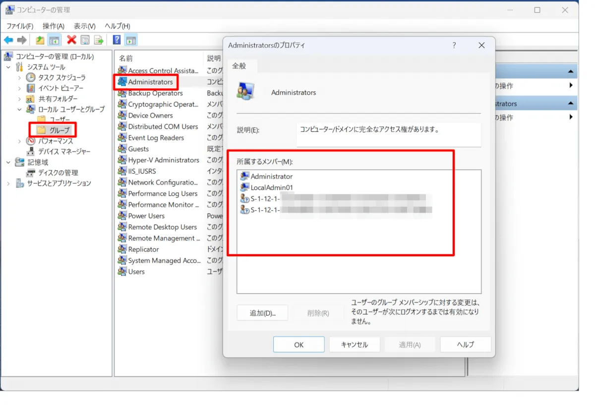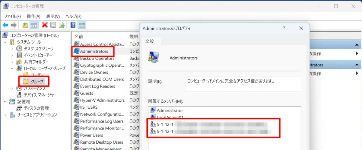 端末の [Windows] ボタン右クリック > [コンピューターの管理] > [ローカル ユーザー とグループ] > [グループ] > [Administrators] 右クリックより SID が確認できます。