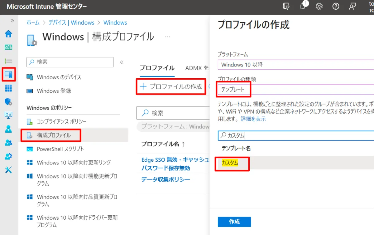 ② 左メニューより [デバイス] > [構成プロファイル] > [+ プロファイルの作成] > [テンプレート] > [カスタム] を選択して作成します。