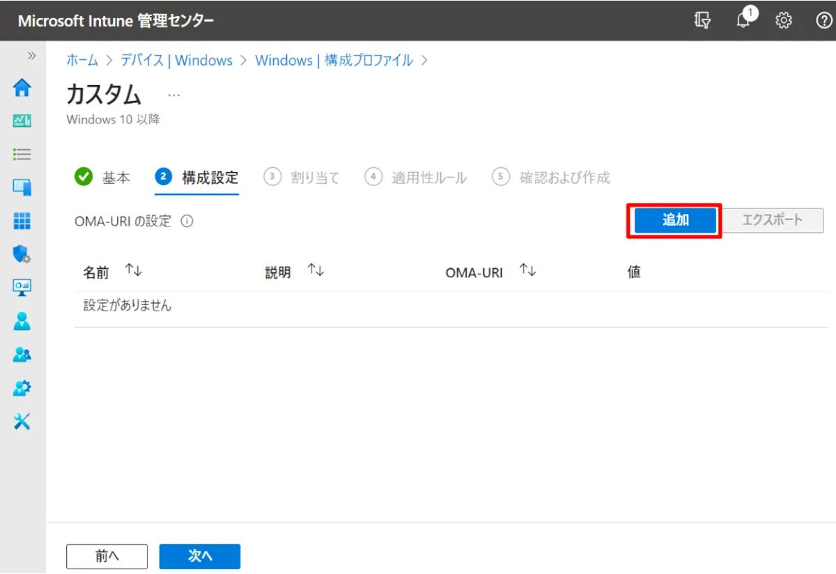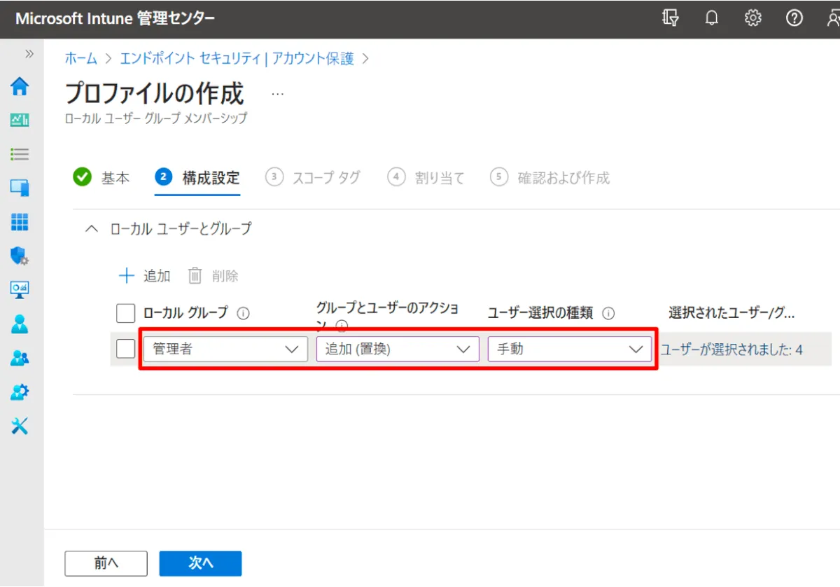 Intune の構成プロファイルでローカル管理者を作成。すでにローカル管理者があるからいらないっていう人はやらないくて良い構成。