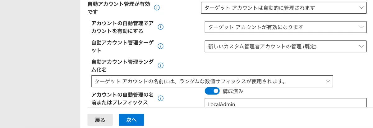 - 自動アカウント管理ターゲット:管理対象とするアカウントの種類を設定します。組み込みの Administrator アカウントを管理する方式と、LAPS が新しいカスタム管理者アカウントを自動作成して管理する方式 (既定) から選択できます。