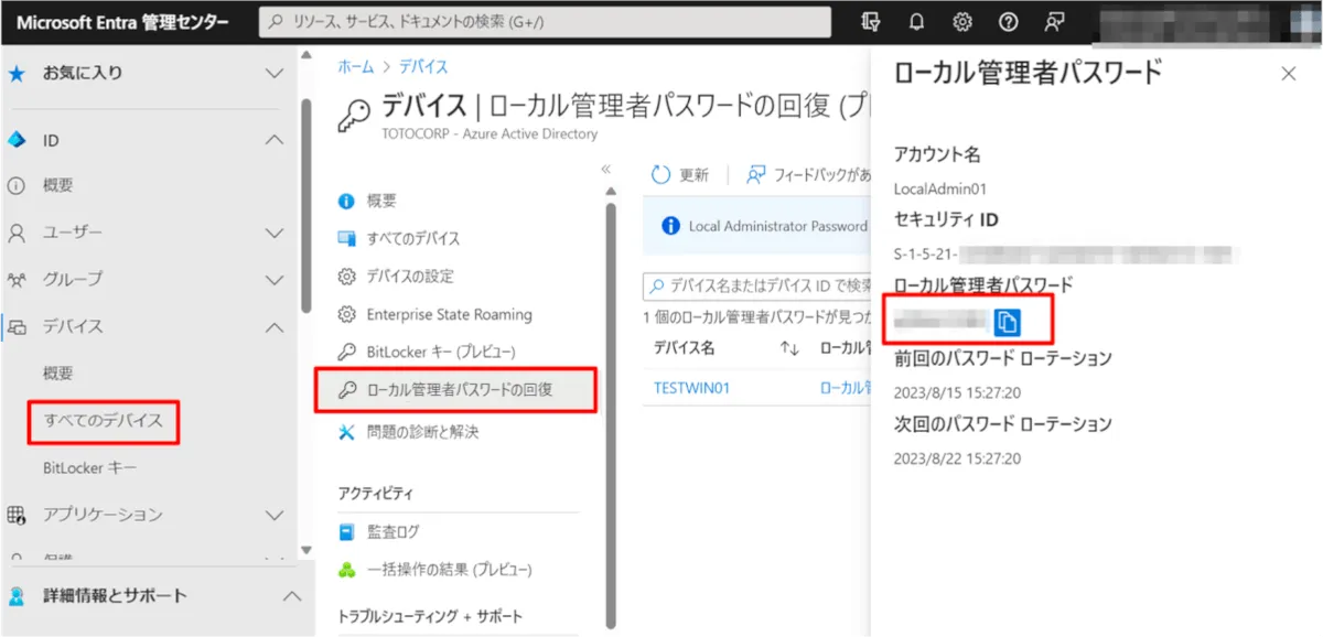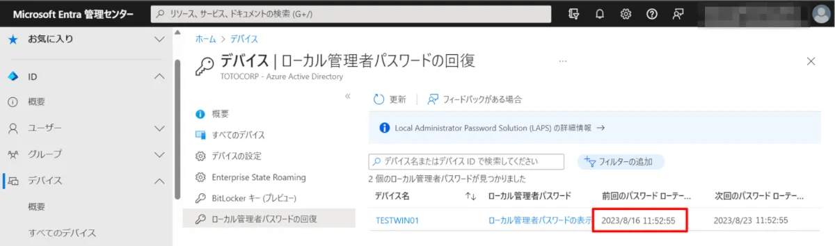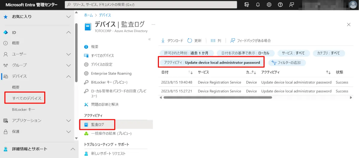 LAPS のログでは、端末と Microsoft Entra 管理センターから確認することができます。